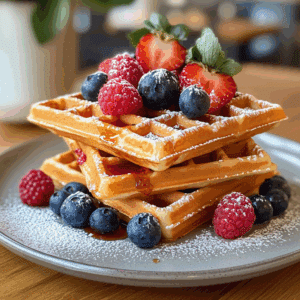 Nutrition Info: Approximately 220 calories per waffle (without toppings), with a good balance of carbs and protein from the eggs and flour.